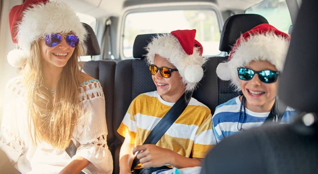 3 young people in a car wearing Santa hats dressed in summer clothing.