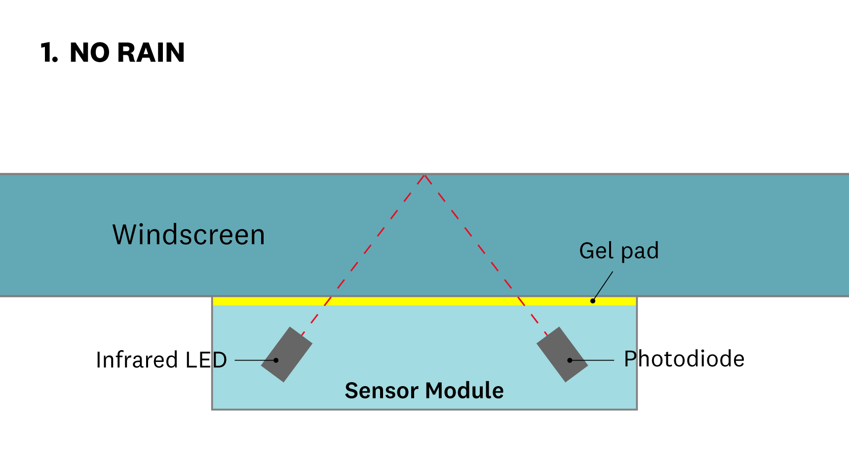 However, when drops of water fall on the windscreen, this process is disrupted and some of the infrared light escapes through the water droplets, meaning less is received by the photodiodes.