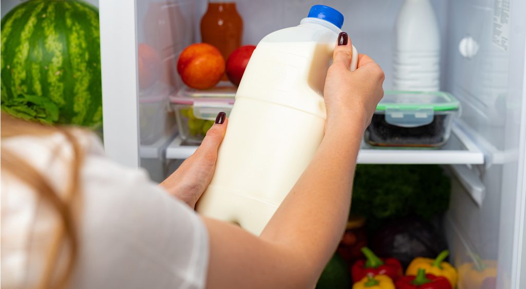 A woman's hand removing a container of milk from the fridge