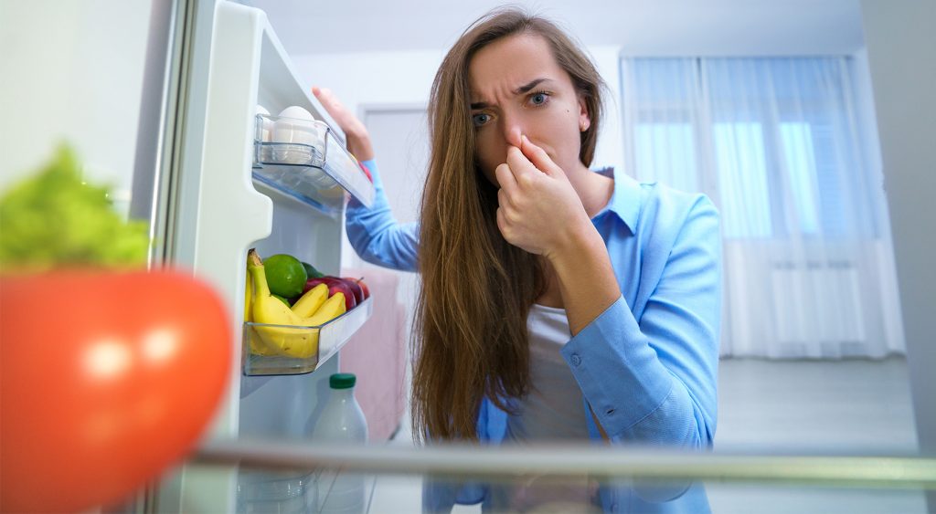 A woman holding her nose in front of the open refrigerator