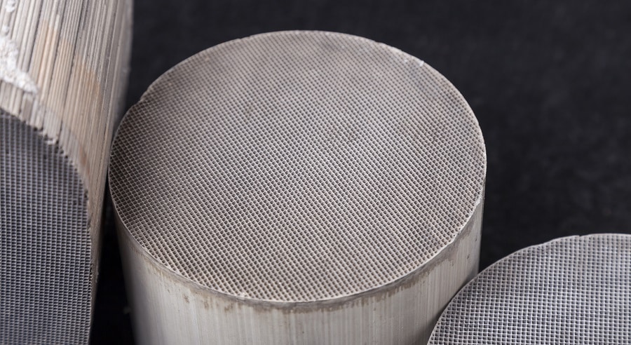There are different types of catalytic converters, but they’re commonly comprised of a stainless-steel case with a ceramic honeycomb-style interior coated in the precious metals platinum, palladium and rhodium – some even include gold.